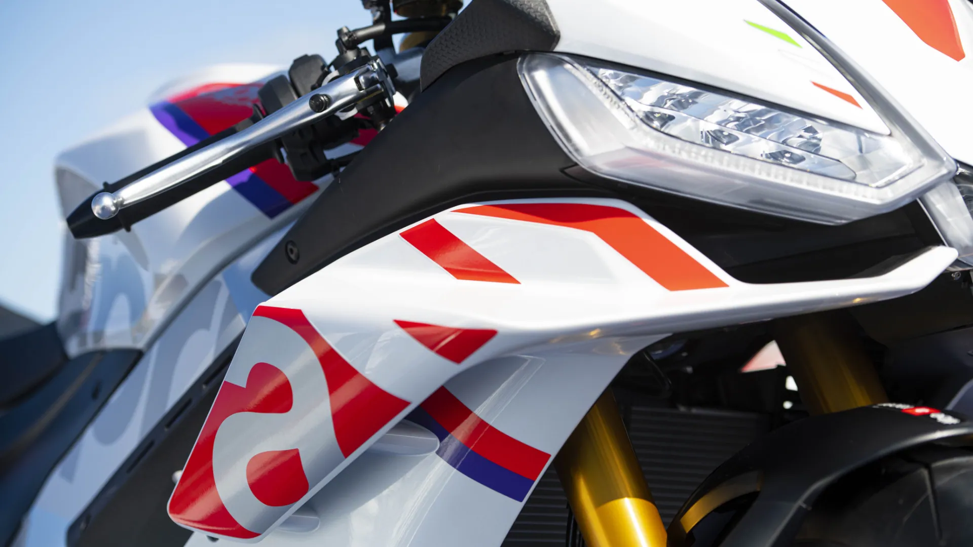 彰显最新一代Aprilia运动摩托车的典型特性,以动感、现代的线条和内敛的涂装风格为特色,经典的三重LED大灯组件及环绕主灯的DRL(日间行车灯)构成,这种排列确保RSV4在任何照明条件都是最亮眼的存在。并具备“弯道灯”功能,可在转弯时打出抛物线形的光束,照亮弯道内侧,增加了转弯时的能见度。